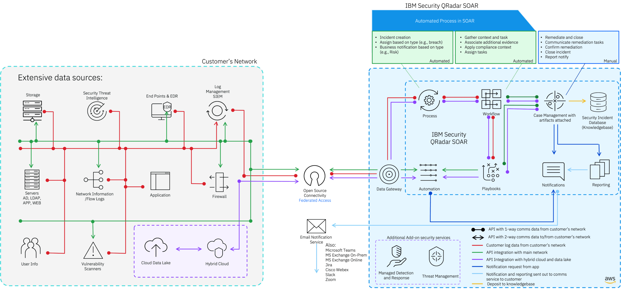QRadar can be deployed on premise or accessed as a service on Amazon Web Services (AWS), simplifying deployment across cloud environments and enabling integration with public cloud and Software as a Service (SaaS) log data. This ensures scalability for large-scale data ingestion, rapid analytics, and subsecond search capabilities. It provides over 900 pre-built integrations, providing flexibility across IBM and third-party products.