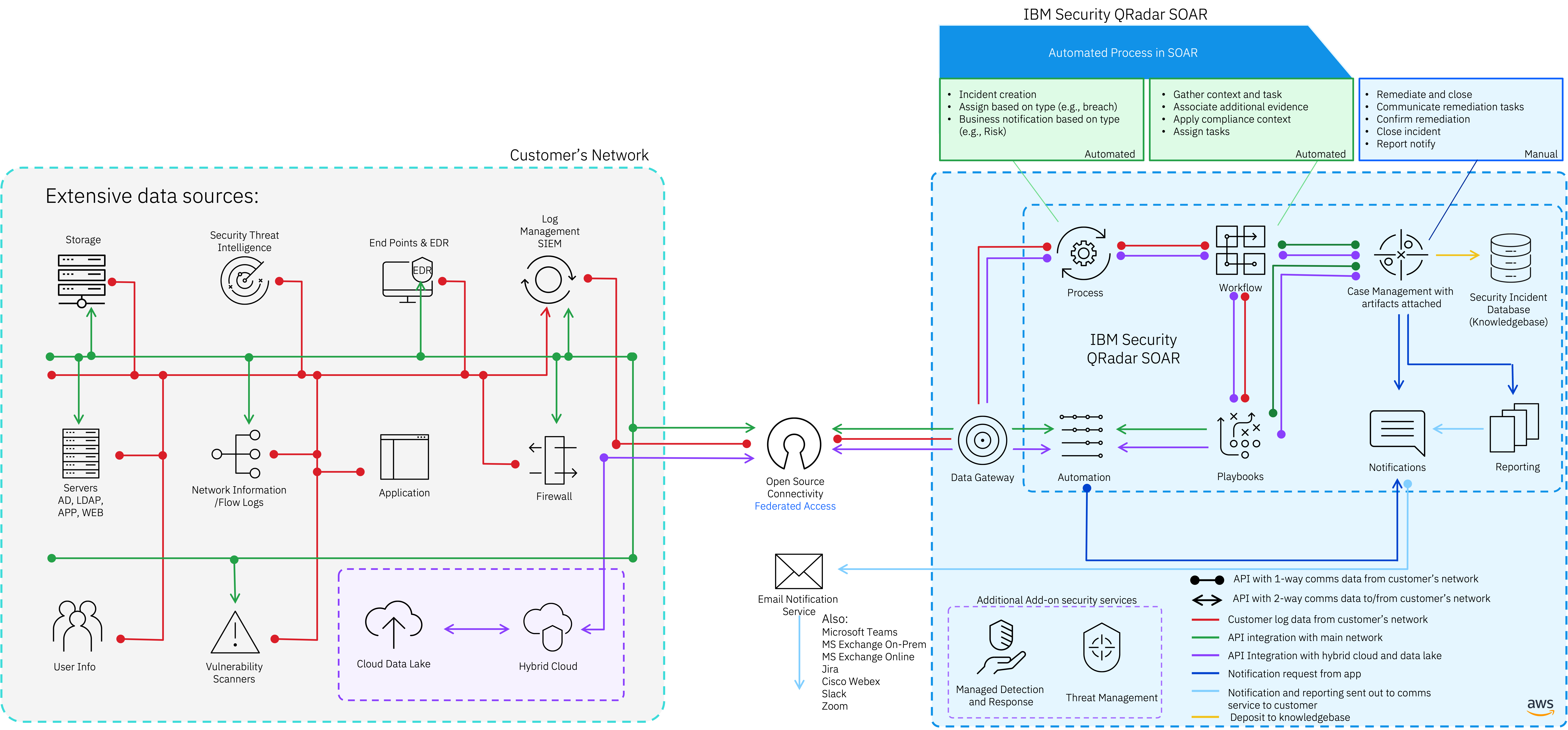 QRadar can be deployed on premise or accessed as a service on Amazon Web Services (AWS), simplifying deployment across cloud environments and enabling integration with public cloud and Software as a Service (SaaS) log data. This ensures scalability for large-scale data ingestion, rapid analytics, and subsecond search capabilities. It provides over 900 pre-built integrations, providing flexibility across IBM and third-party products.Â