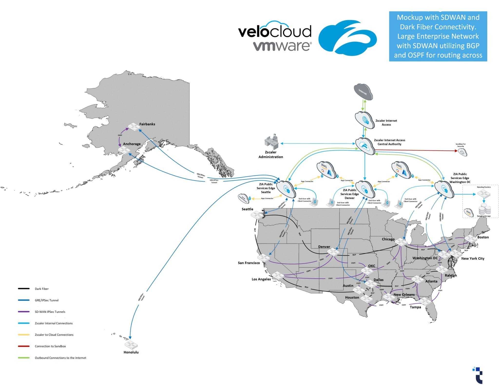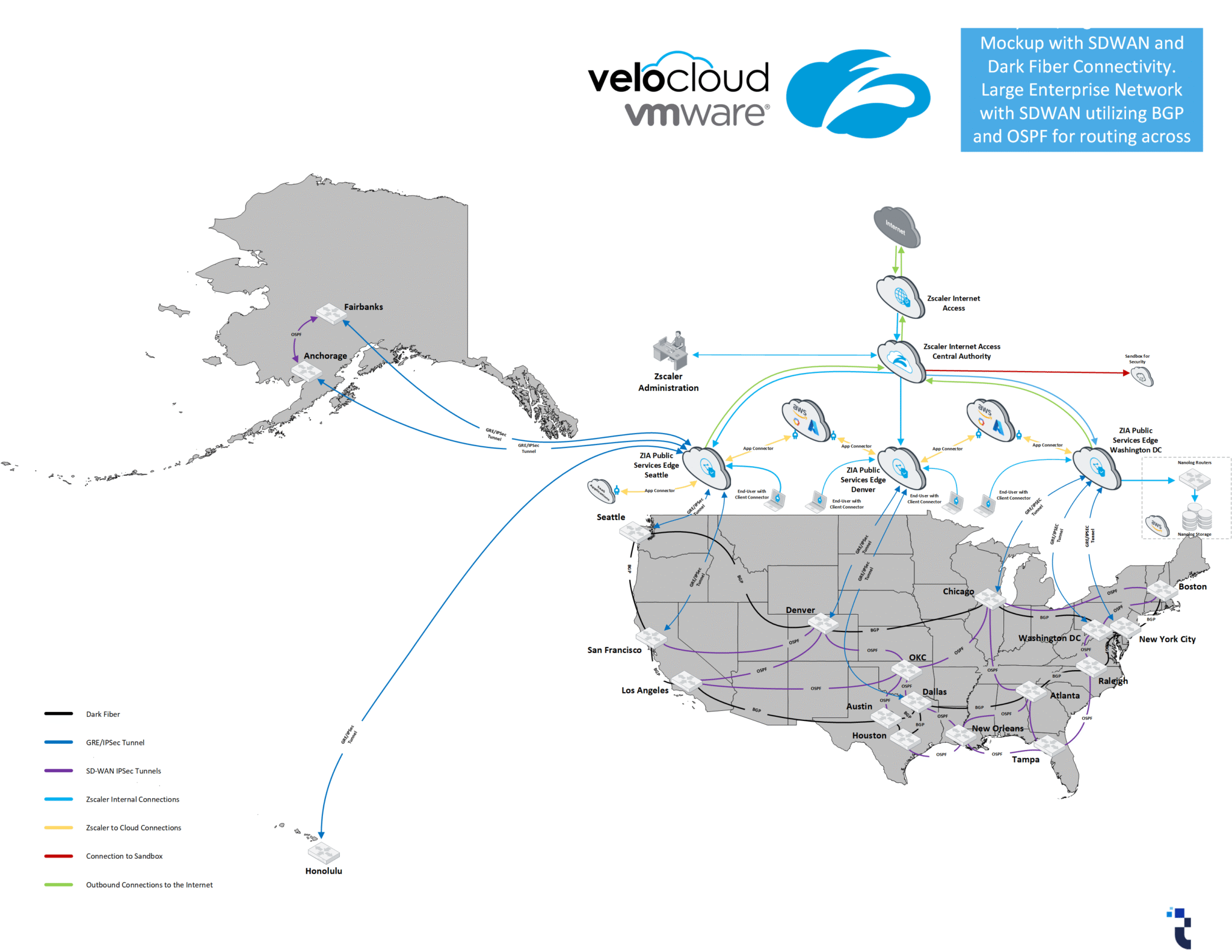 Designed a Wide Area SASE solution as part of a Zscaler interview exercise, connecting U.S. branch and datacenter locations via SD-WAN and Dark Fiber.