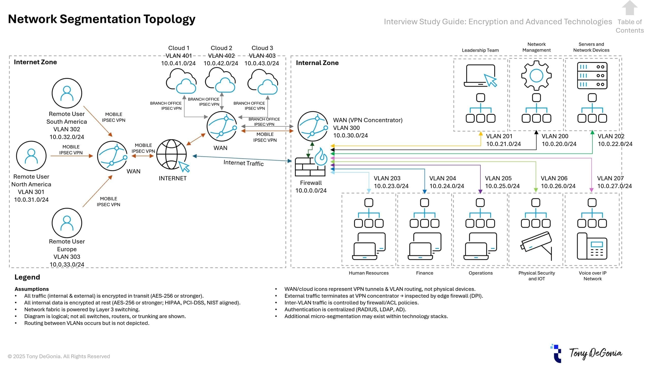 Encryption at Segmentation Boundaries: Traffic between VLANs or over WAN links should leverage IPSec, GRE, or SSL/TLS tunnels—illustrated in the diagram—to ensure confidentiality across hybrid environments.